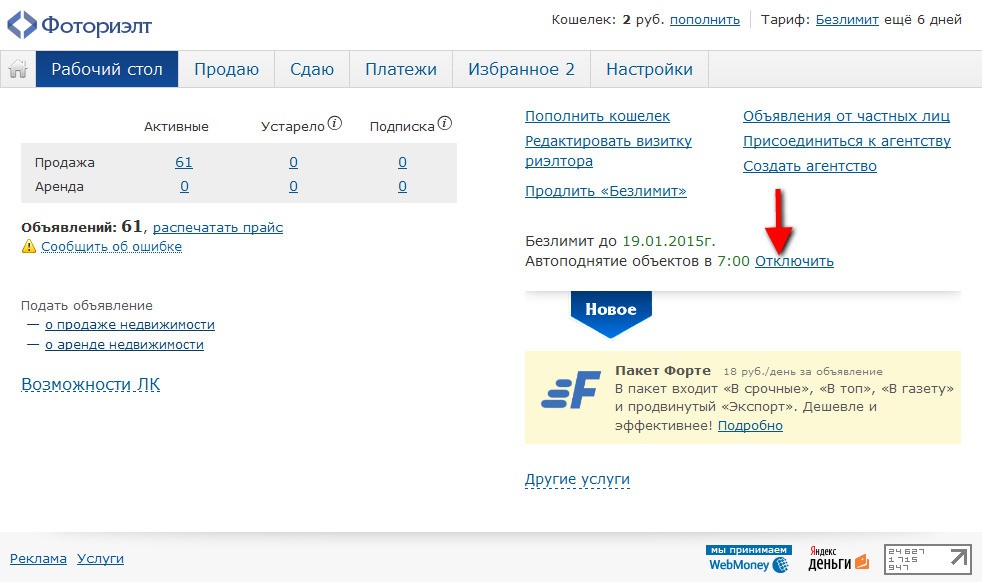 На рабочем столе личного кабинета, напротив надписи «Автоподнятия объектов в 7:00» необходимо нажать на ссылку «Отключить»